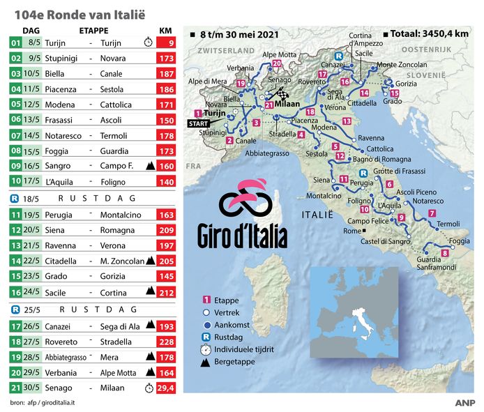 2021 Giro D Italia Live Stream Preview Start List Route Details Results Photos Stage Profiles On Demand Online Www Cyclingfans Com from www.cyclingfans.net Die laatste zege moest hij inleveren, nadat hij wegens het gebruik van ongeoorloofde middelen met terugwerkende kracht werd geschorst. In 2021 wordt de giro weer traditioneel verreden in mei. De koers zal starten in turijn en eindigen met een tijdrit in milaan. Maandag komt de ronde van italie practisch voor mijn deur langs,,rijd er nat als bij de ronde van frankrijk ook een reclamecaravan voor de wielrenners uit? In 16 dagen krijg je een bijzondere reis voorgeschoteld langs de vele vergeet onderweg niet te genieten van de goede italiaanse keuken en wijnen. Dat heeft de organisator rcs sport vrijdag bekendgemaakt. Bekijk hier de route van de giro 2021. Kom alles te weten over de grand prix van italië 2021.