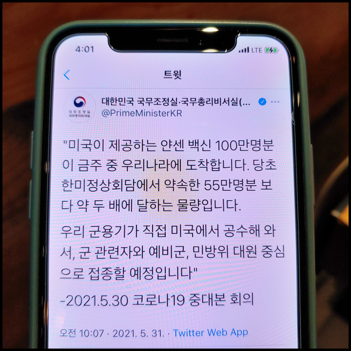 내일부터 미국이 제공한 얀센 코로나 백신 100만명분에 대한 접종 예약이 시작된다.